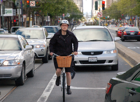 In a regular evening rush-hour, hundreds of cycling commuters can be seen employing their sharpest cycling skills to navigate the turn, which requires crossing over two car-clogged lanes and a set of streetcar tracks into a third left-turn lane. Riders must then make the turn sandwiched between motor vehicles.