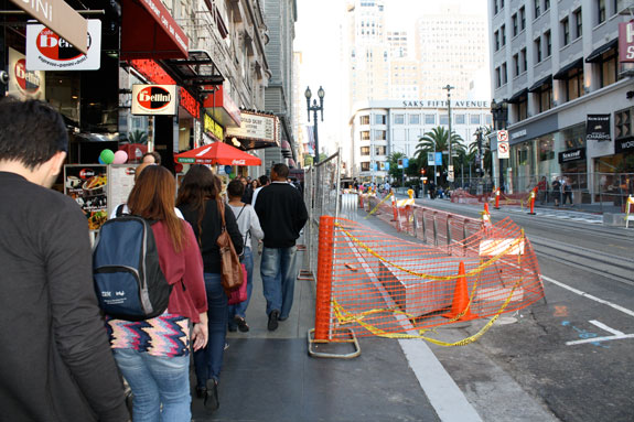 Crews, who plan to work through the weekend, erected temporary fences along the sidewalks on Powell Street between Ellis and Geary and posted signs that say, “We’re expanding the walkway to enhance your walking and shopping experience. Please be patient while the installation is taking place.” The narrow, congested sidewalks on this section Powell Street are packed with high pedestrian volumes second only to Times Square. More than 100,000 pedestrians visit this stretch on an average weekend.