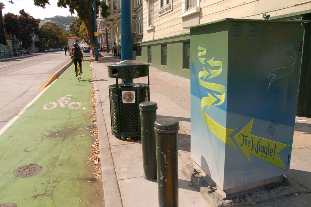 Artist Mona Caron, who created the mural along the bikeway along the back of the Safeway building, added new touches to the Muni utility boxes on the sidewalk. On one side of the boxes, bicyclists entering the Wiggle are greeted by an illustrated flowing banner that lists the names of the streets that make up the route. On the other side, pedestrians are treated with a window to a re-imagined intersection featuring an uncovered Sans Souci Creek (which once roughly followed the path of the Wiggle), an agricultural plot, and an open community area replacing the Safeway and its parking lot.