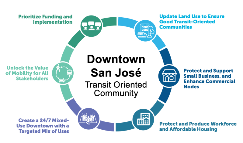 Maximize the opportunities to live and work downtown: Downtown is starting to attract unprecedented interest from new office developers and tenants as a result of the planned BART extension; proximity to the planned Google Village at Diridon; and recent residential development.