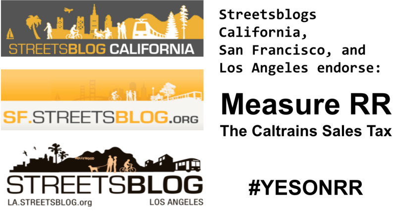 Earlier today, Streetsblog California announced endorsements for statewide ballot measures and measures in Los Angeles county and the Bay Area on behalf of all Streetsblogs in California. As expected, SBCAL endorsed Measure RR: The Caltrains Sales Tax.